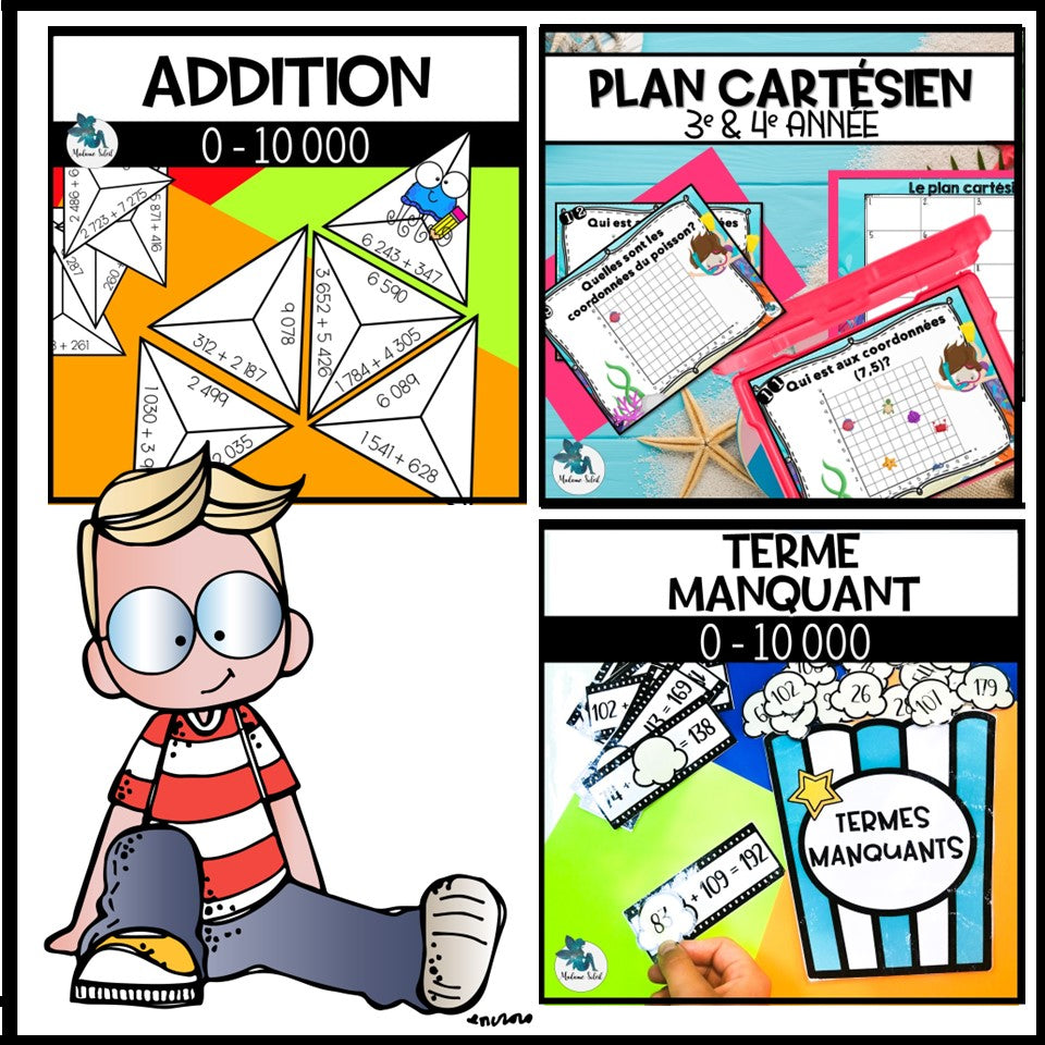 Imprimez les pages nécessaires et distribuez-les selon le type d’atelier. Vos élèves pourront pratiquer l’addition, la soustraction, les termes manquants ou encore explorer le plan cartésien. Parfait pour un usage en ateliers, en devoirs ou en récupération ciblée !