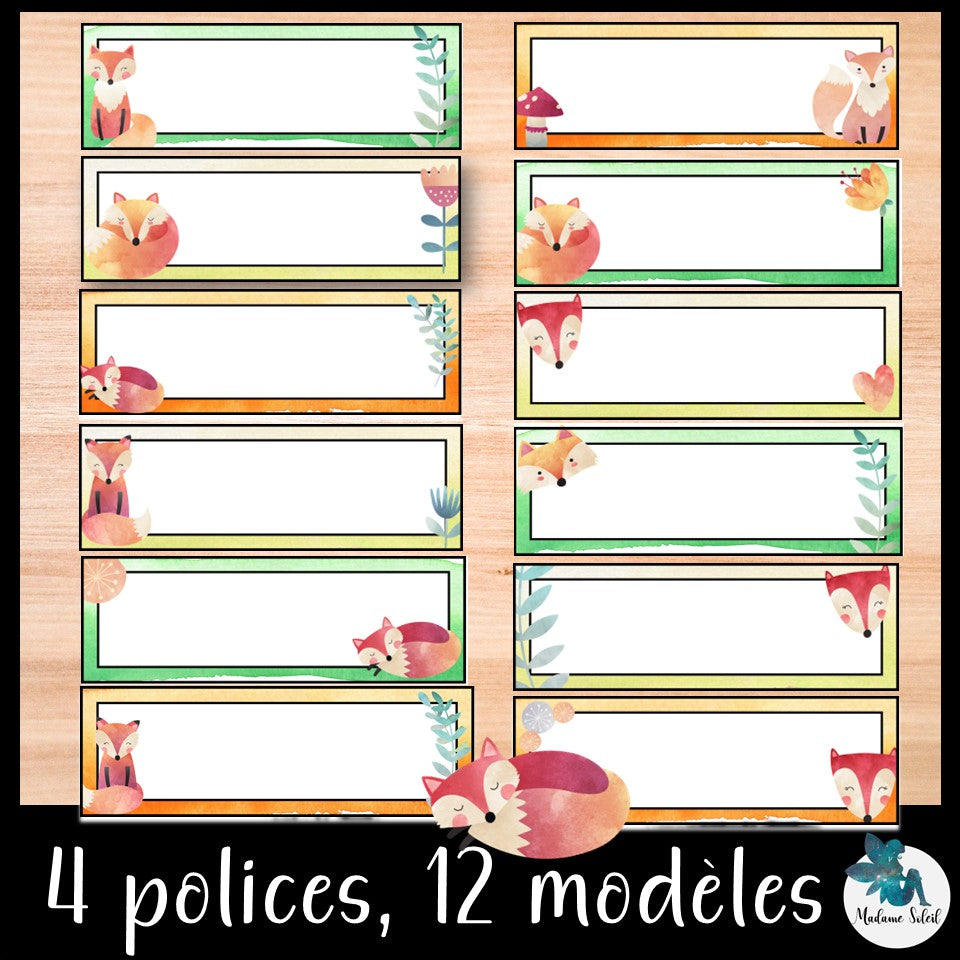 Étiquettes d'affichage de classe, de décor ou d'identification à apposer sur le devant du pupitre contenant le nom ou prénom de l'élève. L'identification sous le thème du renard est à apposer sur le devant du bureau. PDF de 41 pages à imprimer.