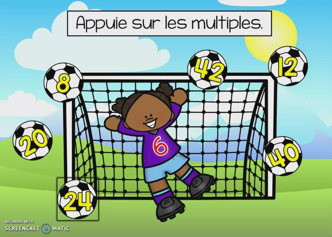 - Sélectionner les 3 ballons qui représentent les multiples du nombre indiqué sur le chandail du joueur