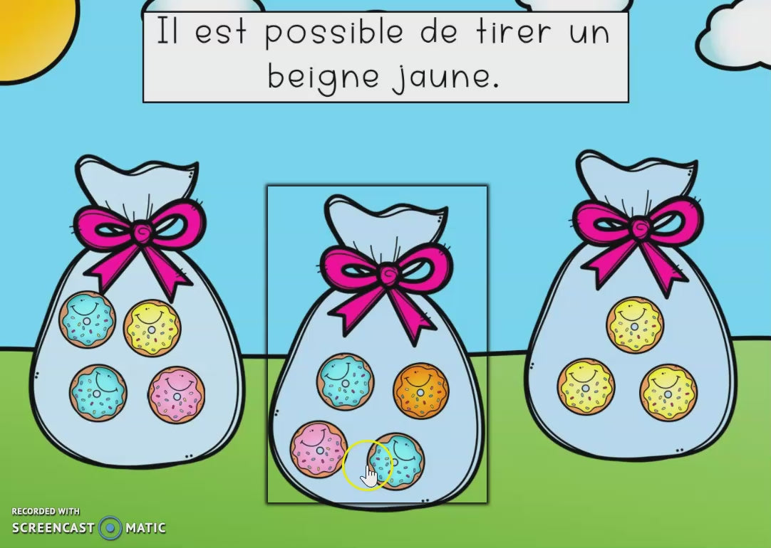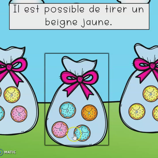 Avec cette activité Boom Cards, vos élèves s’initient au vocabulaire et aux concepts essentiels de la probabilité : certain, possible, impossible, plus probable, moins probable et également probable.