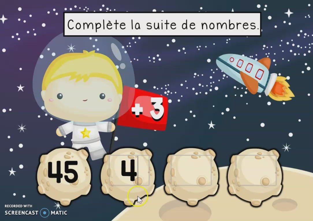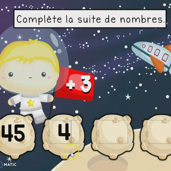 Cette activité de mathématique interactive permet aux élèves de 2e et 3e année de travailler les suites numériques à deux chiffres. L’élève doit observer la régularité, déterminer la règle de la suite et la compléter correctement. Parfaite pour les ateliers de math, les centres de numératie, l’orthopédagogie ou l’enseignement à distance… sous un thème spatial captivant!